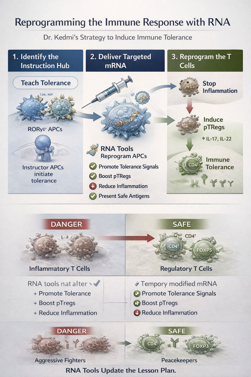 Dr. Kedmi’s approach builds on a key biological insight: certain antigen-presenting cells (APCs), particularly RORγt⁺ APCs, act as instructors that initiate regulatory T cell (pTreg) responses. These regulatory T cells are the immune system’s “peacekeepers” who actively suppress inappropriate inflammation and promote tolerance to harmless antigens like food or gut microbes.